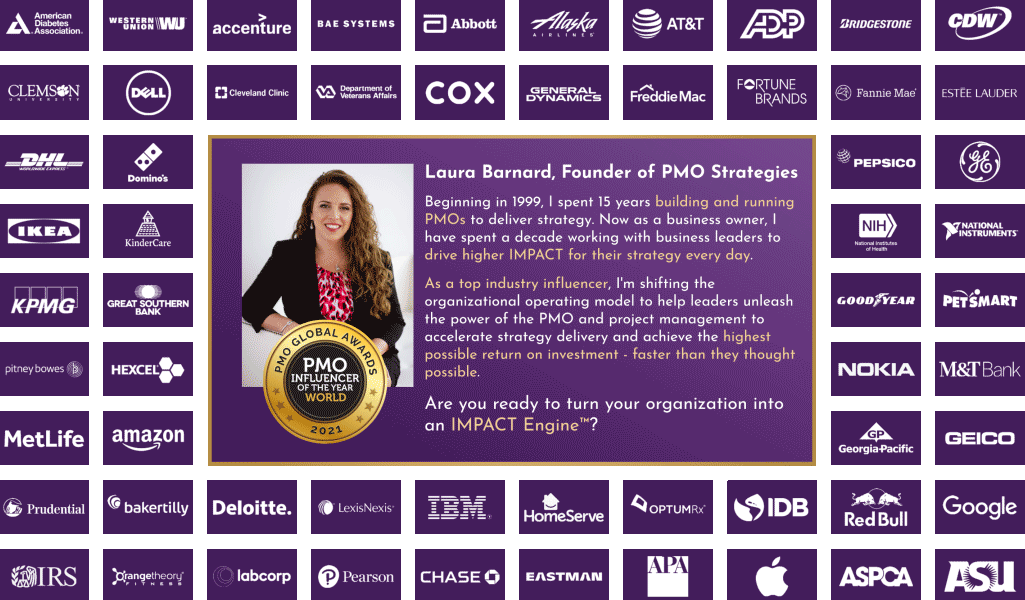 Over her time in the industry, Laura has developed a distinct, battle-tested system for advancing organizational project management proficiency with a deliberate focus on driving high-IMPACT outcomes. Fittingly, she’s been recognized as the 2021 World PMO Influencer by the PMO Global Alliance at the Project Management Institute, a designation she’s earned in part by sharing her stories on the popular PMO Strategies Podcast and as host of the longest-running PMO-specific virtual conference, the IMPACT Summit, where she’s been shaking up the way the industry views the PMO’s role in delivering strategy.